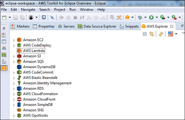 安装后,AWS 工具将在 Eclipse 中可用,如下所示-
