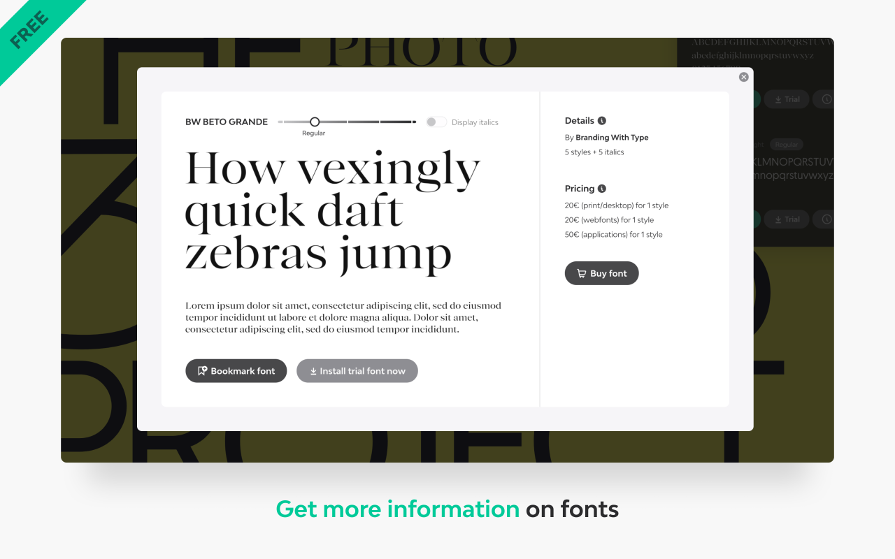 从任何网站、书签、试用和购买中识别字体。 ----------------- 特征 : 字体DNA 我们的专有算法分析字体文件以获得更准确的结果。 滚动任何文本以获取字体名称和 CSS 属性。 主扩展窗口还将显示网站上使用的所有字体的摘要。 顺便说一句,我们显着提高了处理速度(这可能会因网站而异)。 字体细节 您可以获得有关字体的更多信息。查看有多少款式可供选择、它们的代工厂和价格。 字体书签 在扩展程序中为字体添加书签并管理您的字体书签。 试用字体(仅限高级版) 可选的 macOS/windows 应用程序会安装您在网站上发现的字体的试用版。然后您可以在任何软件中使用它们。 这是一项免费试用的付费功能。 反馈和支持:contact@fonts.ninja
