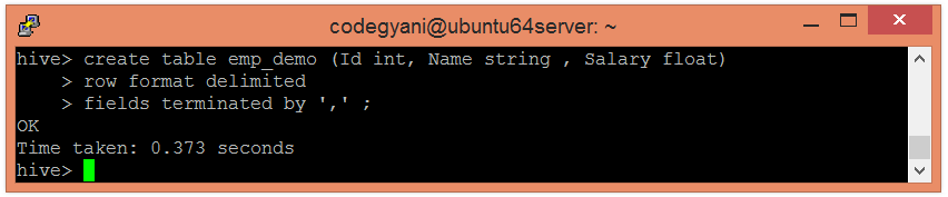 hive> create table emp_demo (Id int, Name string , Salary float) row format delimited fields terminated by ',' ;