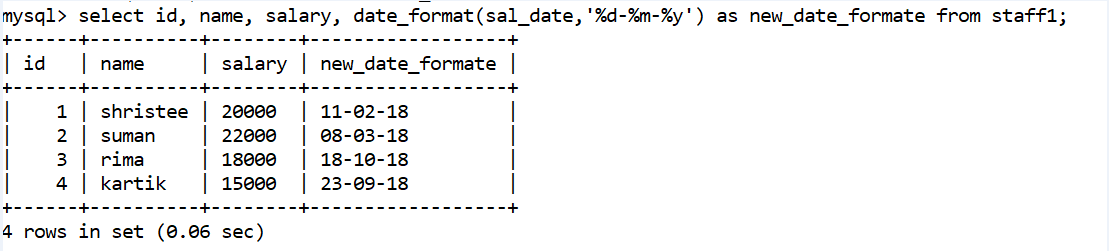 select id, name, salary, date_format(sal_date,'%d-%m-%y') as new_date_formate from staff1;