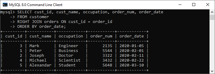 SELECT cust_id, cust_name, occupation, order_num, order_date