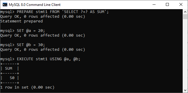 mysql> PREPARE stmt1 FROM 'SELECT ?+? AS SUM';