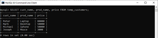 Mysql> SELECT cust_name, prod_name, price FROM temp_customers;