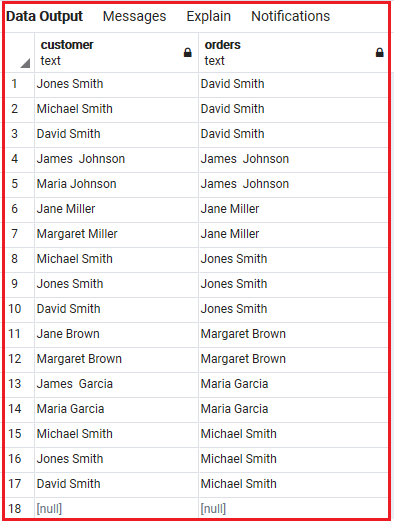 正如我们在上面的输出表中所看到的, Customer 表执行两次,一次作为客户,另一个作为订单。