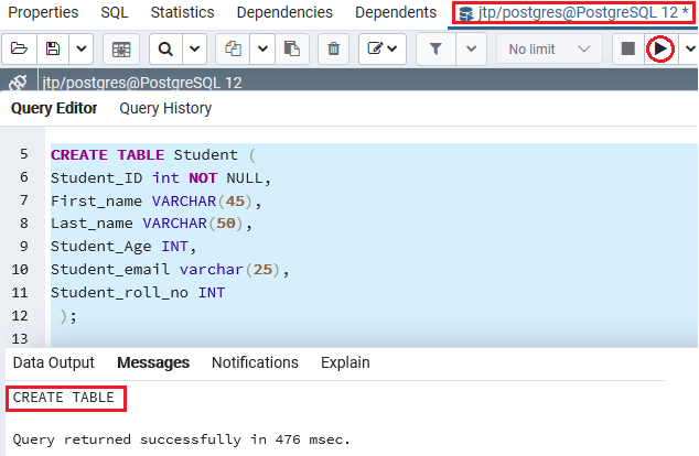 实施上述命令后,我们将获得以下消息窗口,其中显示 Student 表已成功创建到 Jtp 数据库中。