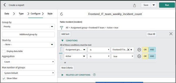 单击下一步,您现在可以配置报告。在"分组依据"选项中,我们将选择"优先级",在"聚合依据"中,我们将选择"计数"。
