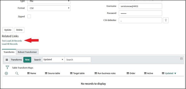 单击提交按钮后,再次打开数据源,然后单击相关链接部分中的"测试加载 20 条记录"。ServiceNow 现在将尝试通过 FTP 测试加载记录,因此请确保该文件存在在提到的位置。