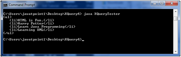 将上述三个文件放在同一位置。我们将它们放在桌面上的文件夹名称XQuery4中。使用控制台编译XQueryTester.java。您必须在计算机上安装JDK 1.5或更高版本,并且已配置类路径。